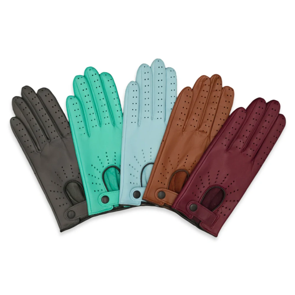 Dámské řidičské rukavice s perforací, olemované ( zakončené ) kontra barvou kůže se zapínáním na druk.