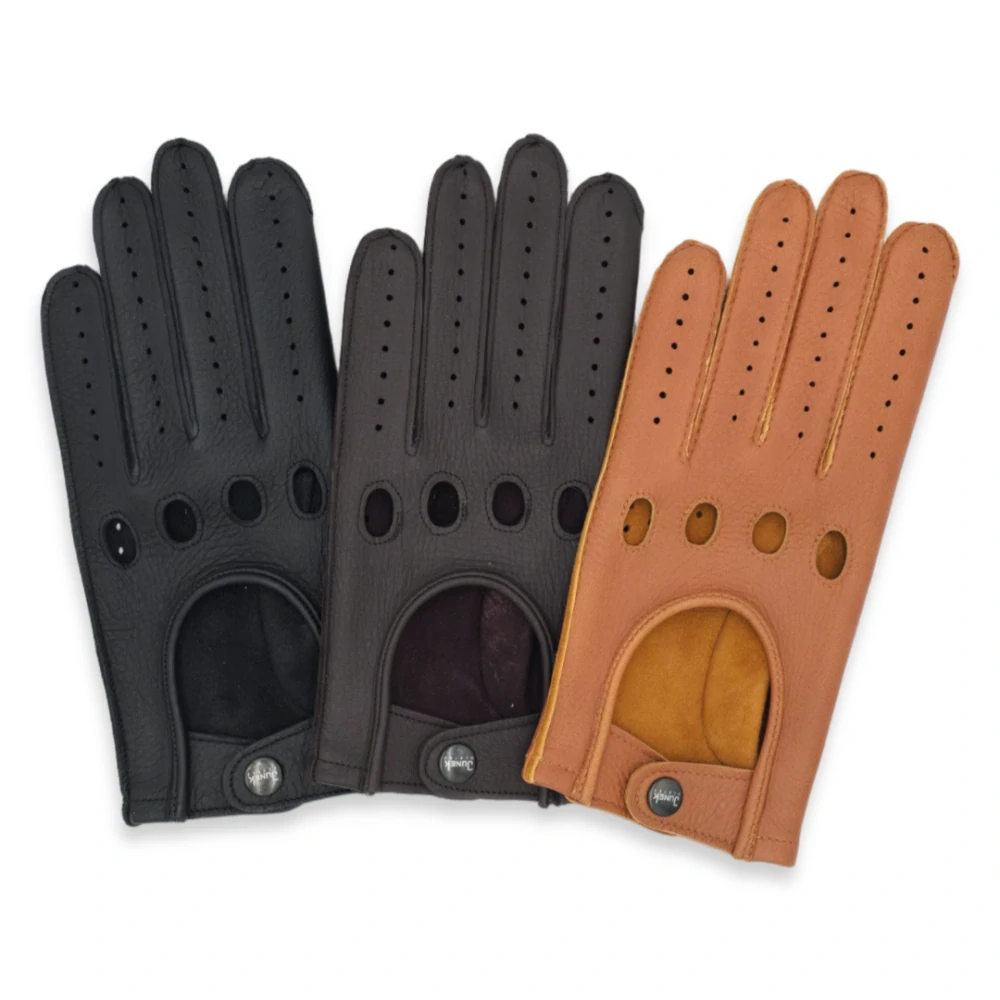 Pánské řidičské bez prsté rukavice z amerického jelena. Rukavice jsou šité vrchním šitím - laš se zapínáním na druk. Tento materiál je masitý a jeho charakteristikou je hrubší struktura líce.
