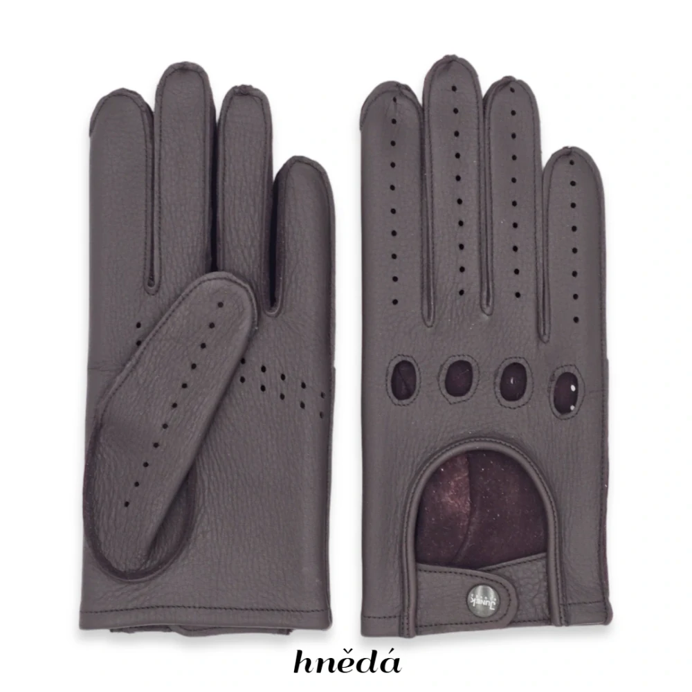 Pánské řidičské bez prsté rukavice z amerického jelena. Rukavice jsou šité vrchním šitím - laš se zapínáním na druk. Tento materiál je masitý a jeho charakteristikou je hrubší struktura líce.
