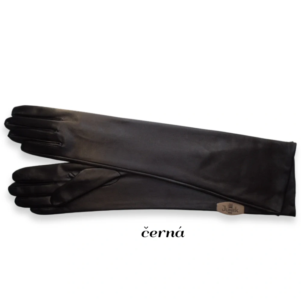 Dámská společenská rukavice z jemné jehněčí kůže. Délka zápěstí (od kořene palce k okraji rukavice) je 30 cm = 11 coulů. Celá délka rukavice je 49 cm a sahá až k lokti. Rukavice je bez podšívky.