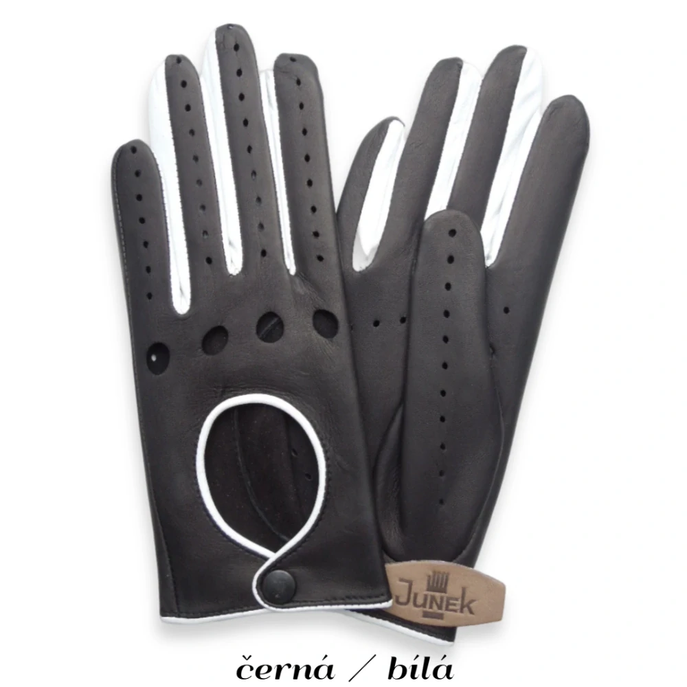 Dámská kožená rukavice řidičská v kobinaci černo/bílá z jenmé jehněčí kůže.Na vrchu rukavice jsou otvory na klouby a perforace.
