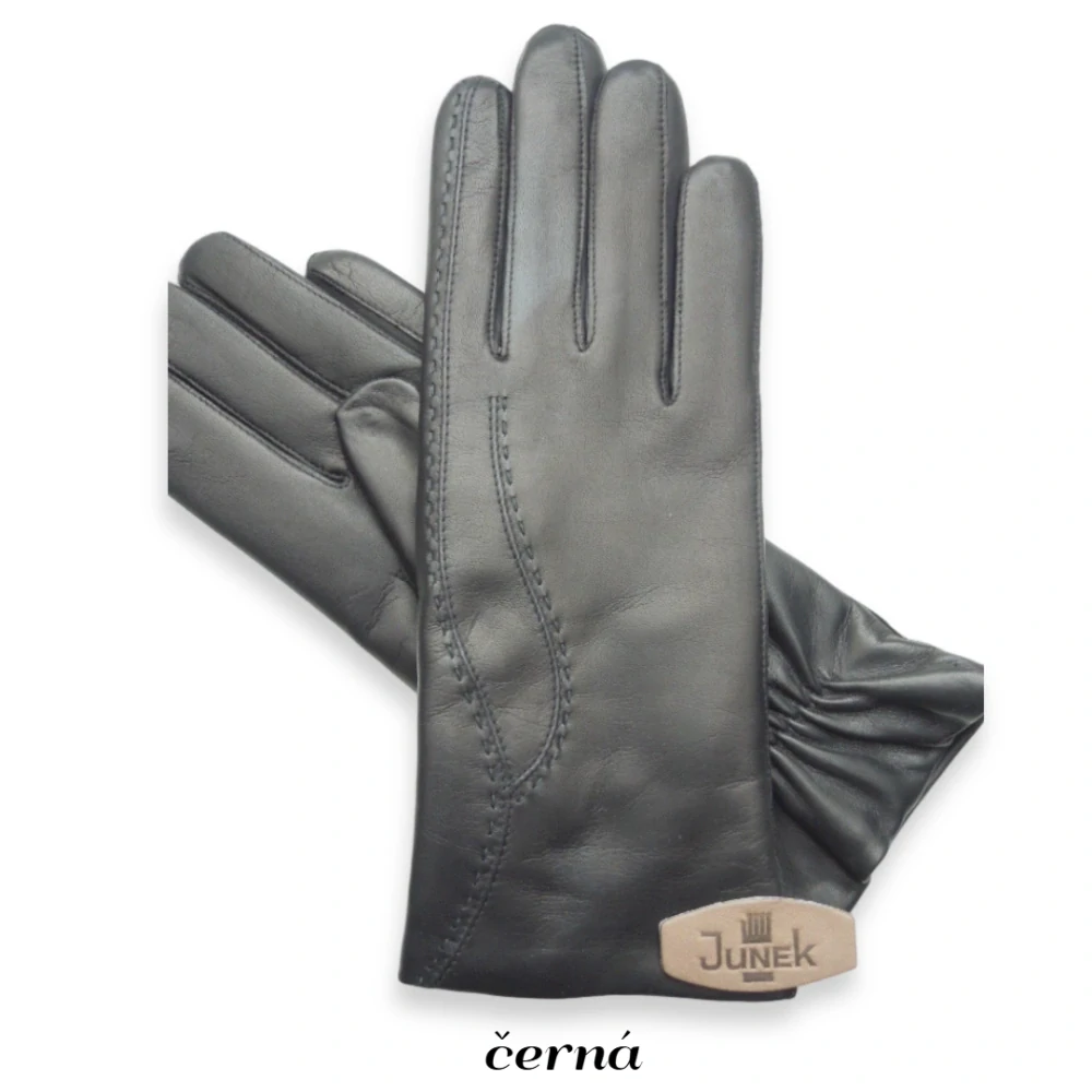Dámská kožená jehnětina z jemné jehněčí kůže.Ozdoba strojní s ruční vyšívkou a stažená gumičkou v zápěstí.Tím rukavice lépe sedí na ruce.Podšívka 100% vlna.