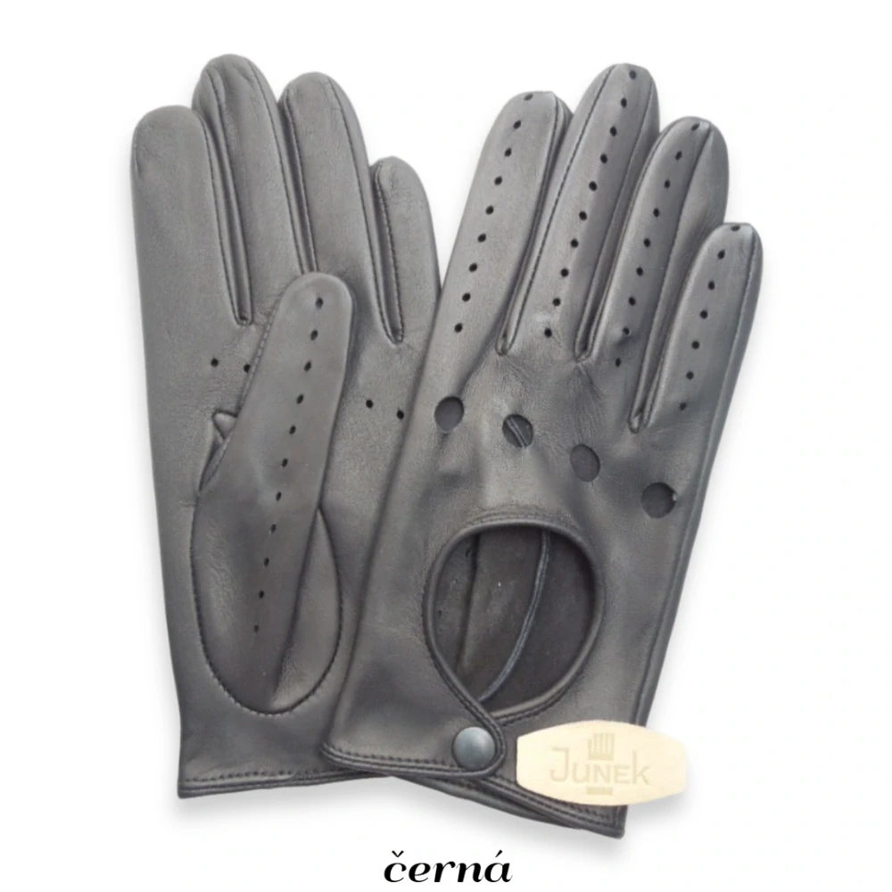 Dámská kožená řidičská rukavice z jemné jehněčí kůže,s otvory na kloby a perforací.