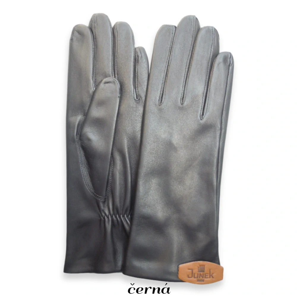 Dámské rukavice z jemné jehněčí kůže. Rukavice je hladká,prodkoužená (délka zápěstí 8 cm) a gumičku pod palcem pro lepší držení na ruce. Podšívka umělé hedvábí.